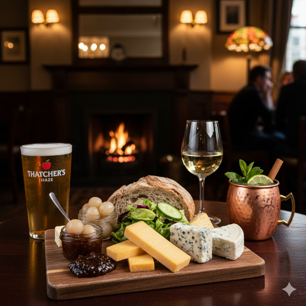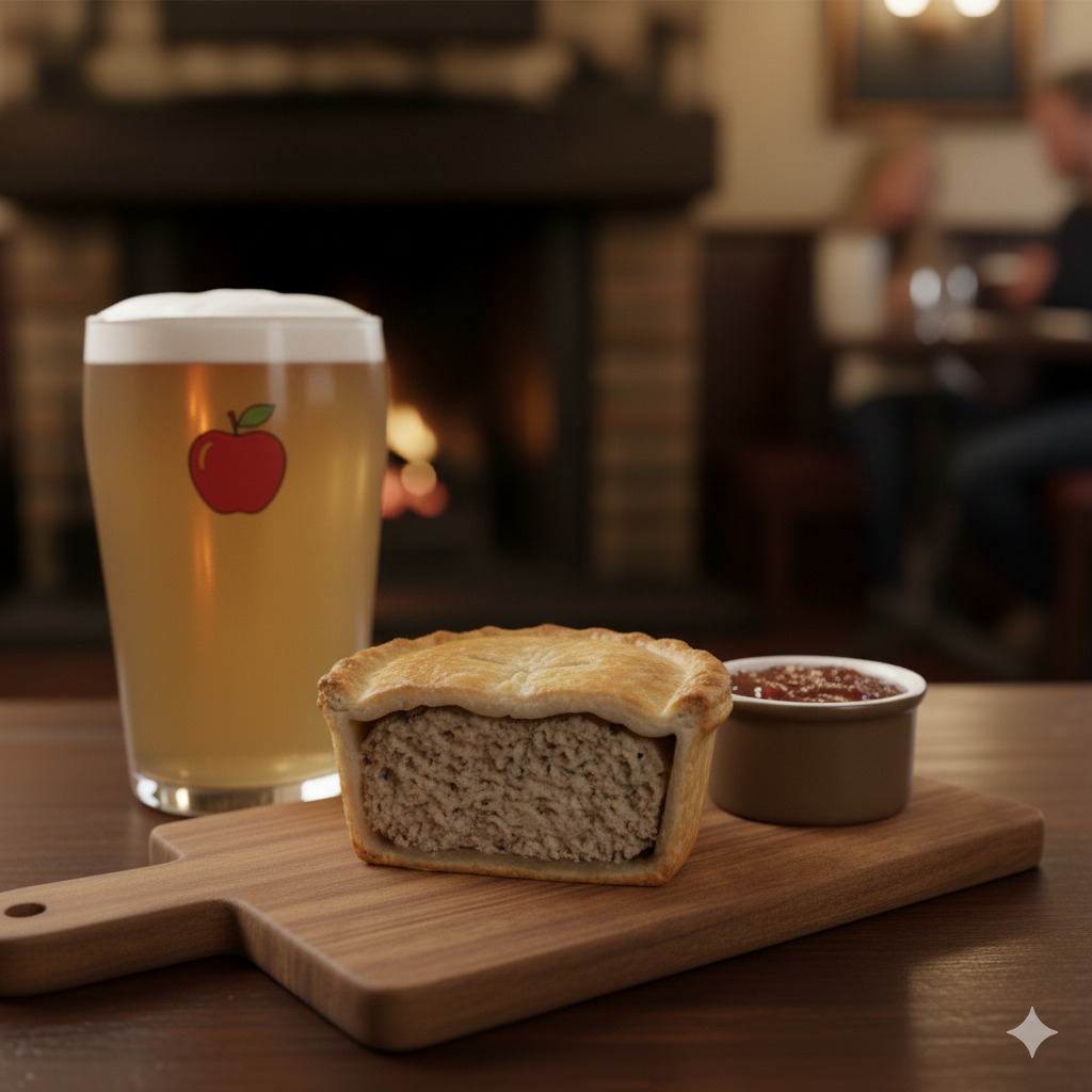 Beer / Cider: Traditional Medium Cider (like Westons Vintage or Cornish Orchards Gold) — apples meeting apples, but with a refreshing sparkle.