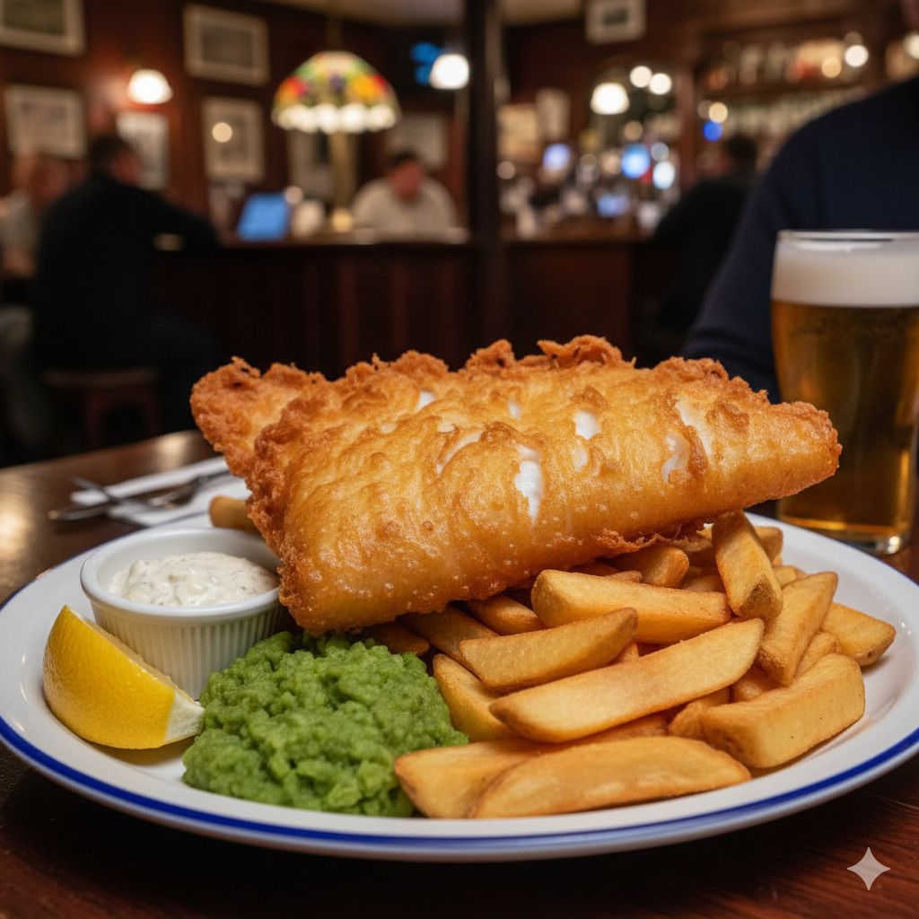 Beer: Sharp’s Doom Bar / Adnams Ghost Ship – crisp bitters that cut through fried batter.