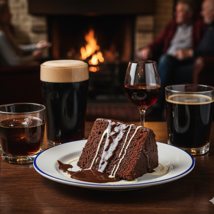 Beer / Cider: Chocolate Stout or Porter — the roasted malt notes blend seamlessly with the cake’s cocoa flavours.