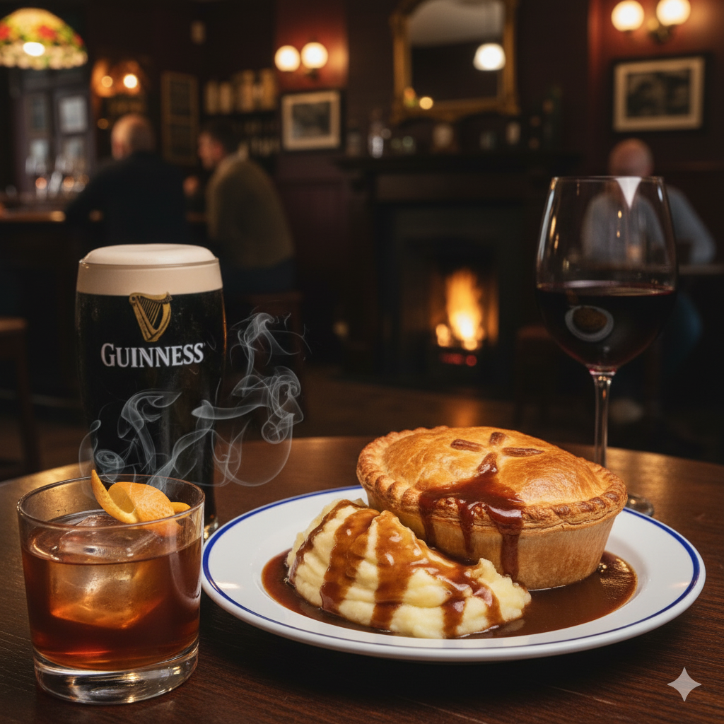 Beer: Guinness / Hobgoblin Ruby – malt richness complements the pie’s deep, meaty gravy.